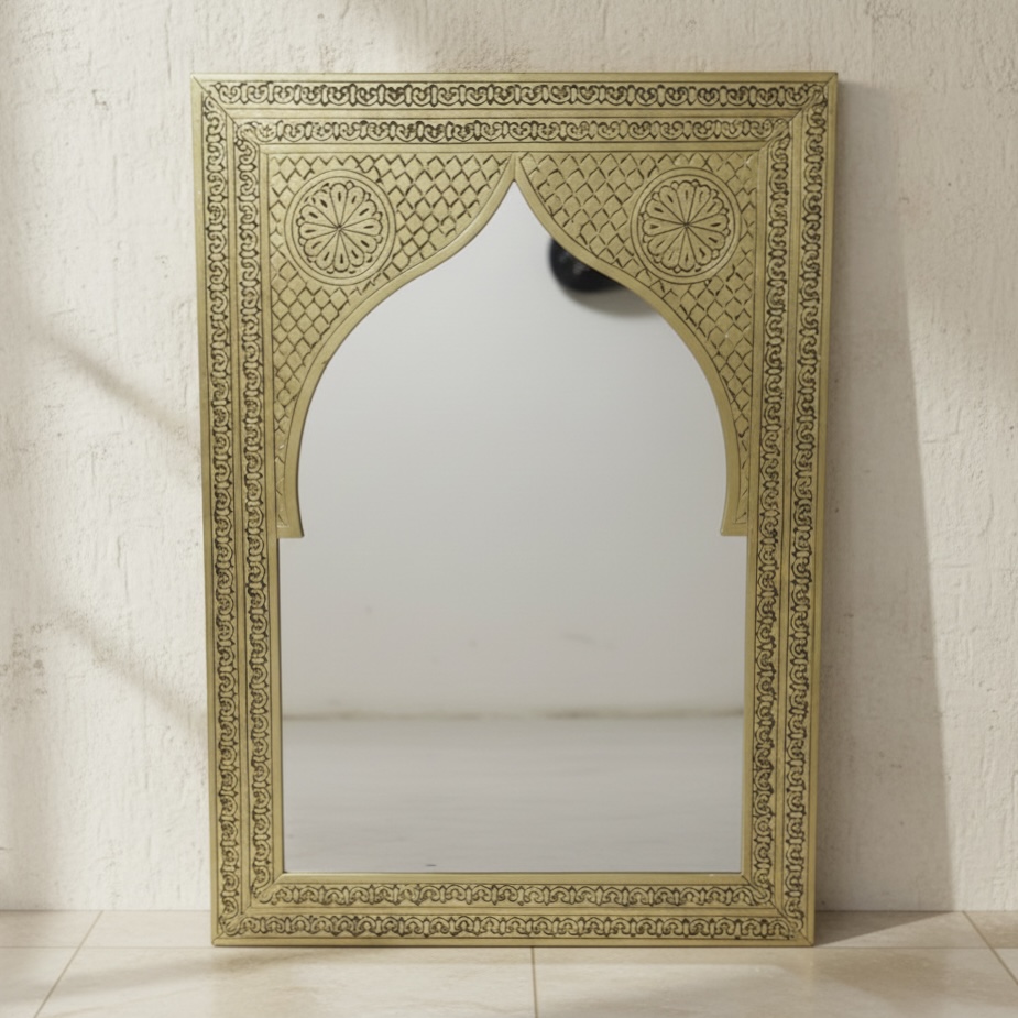 מראה מהממת עשויה נחושת צבועה זהב בעבודת יד מוקפדת. פריט עיצוב ייחודי שאין שני לו. יכניס עומק, אופי וסטייל לכל חלל בבית.