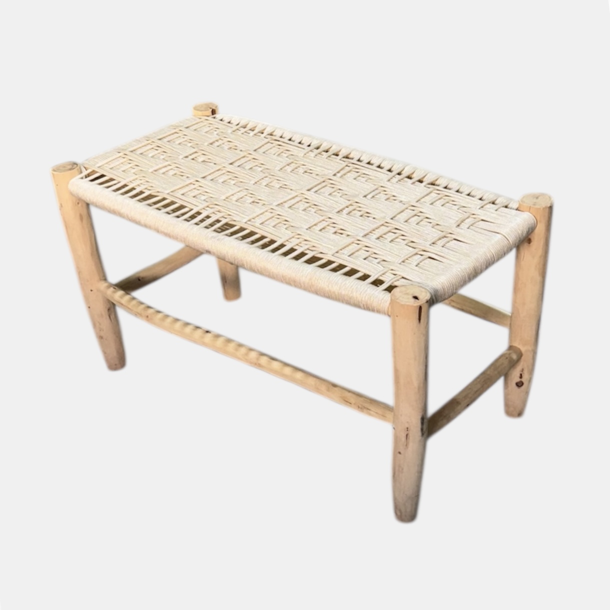ספסל עץ מהמם, מתאים לכל פינה בבית! עשוי עץ אקליפטוס מגולף בשילוב חוטים ירוקים.